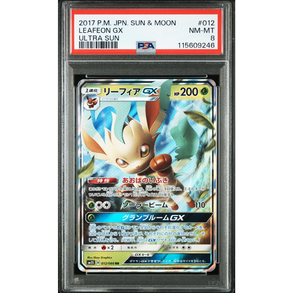 Karta Pokemon Leafeon GX 012 Ultra Sun serii P.M. JPN Sun & Moon oceniona przez PSA na znakomitą ocenę PSA 8 (NM-MT).