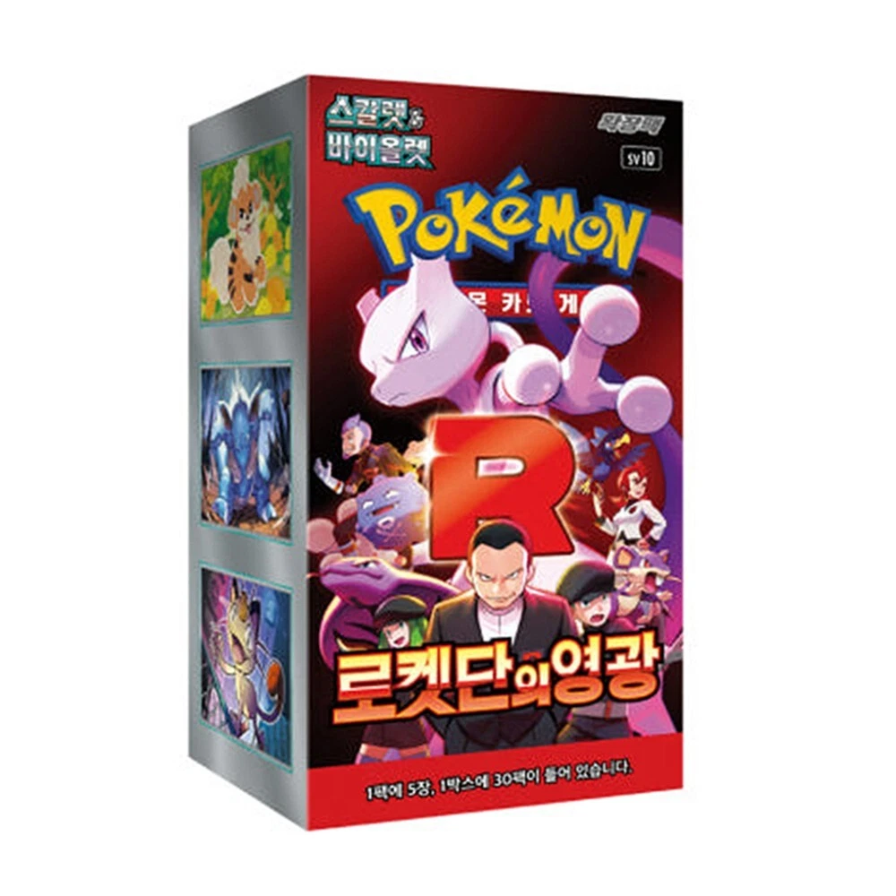 Pokemon Glory of Team Rocket KOREA sv10. Koreański booster box z 30 saszetkami po 5 kart. Produkt kolekcjonerski dla osób powyżej 14 roku życia niebędący zabawką, nieprzeznaczony do gry w Europie.